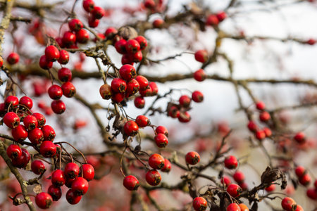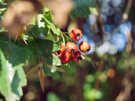 hawthorn fruit in the field on sunny autumn day. outdoor closeup