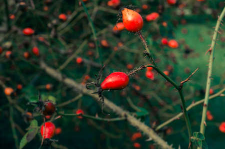 Red rose hips on a bush blurred background. Autumn background. Toned