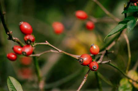 red rosehip berry, autumnal nature outdoors