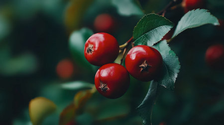 A visually stunning representation of vibrant red berries on a branch, surrounded by lush green leaves. The soft, blurred background enhances the serene and fresh atmosphere of nature.