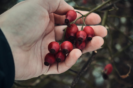 Rosehips in hands with rosehip background, concept of harvest and picking