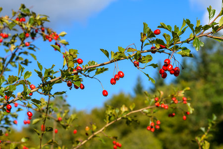 Vibrant Autumn Close-Up: Hawthorn Bush with Red Ripe Berries in Meadow Sunlight, Forest's Edge in Swabian Alb