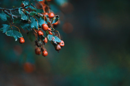 Hawthorn with red berry on the branch, autumn rain water drops, bokeh, shallow depth of the field, toned