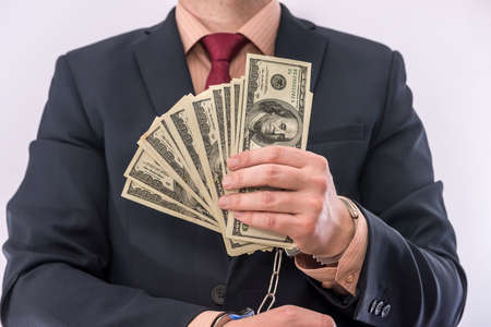 Bribe and corruption areest man who hold dollar in hand cuff, isolated. Crime