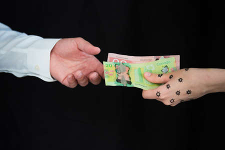 Woman with COVID-19 on hand giving Canadian dollars to man