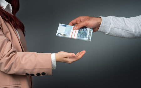 Bribery. A woman's hand gives a bribe a man's hand in a shirt the color of the Russian flag. Side view. White background. Concept of world anti-corruption day, December 9.