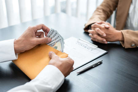 Dishonest cheating in business illegal money, Businessman giving bribe money in envelope to business people to give success the deal contract of investment, Bribery and corruption concept.