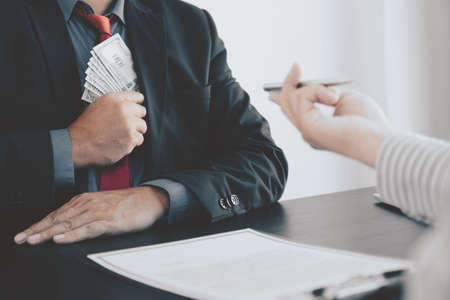 Dishonest cheating in business illegal money, Businessman receive bribe money in business people to give success the deal contract of investment, Bribery and corruption concept.