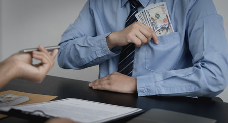 Government official hand receiving bribe money from businessman, the concept of corruption and anti-bribery.