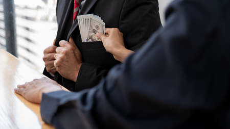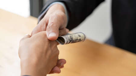 Bribery and corruption concept, bribe in the form of dollar bills, Businessman shaking hands and giving hides money while making deal to agreement a contract.