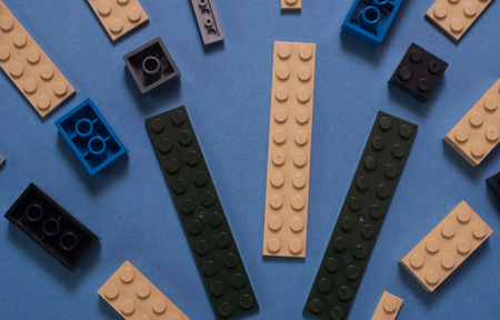 The background of random colored plastic building blocks, pattern on blue background