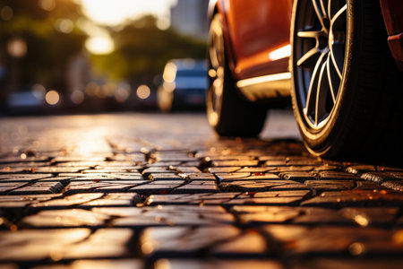 Cobblestone road at sunset. Close up of car wheel.