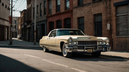 A beautifully preserved vintage car, featuring a dark blue body and a white roof, parked in a rustic urban alley. The retro design, including chrome detailing and an iconic grille, reflects timeless elegance. Surrounded by red brick buildings and urban charm, the setting perfectly complements the classic aesthetic. Ideal for showcasing automobile history, vintage culture