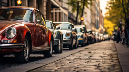 An image showcases parked cars lining a street with buildings visible in the background. The scene is illuminated by sunlight filtering through trees, creating shadows and highlights. The composition suggests an urban or suburban environment. It's suitable for various commercial uses, including website design or editorial content.
