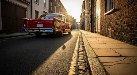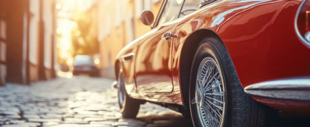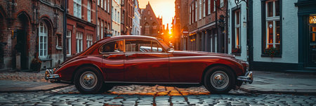 A classic red sports car parked on a picturesque cobblestone street during sunset. The warm light highlights the cars elegant design, showcasing its timeless appeal.
