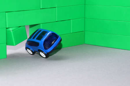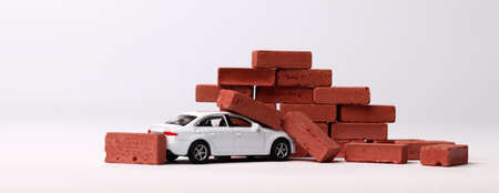 The concept of the dangers of car accidents. A miniature car that collided with a red brick.