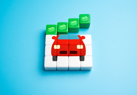 A red toy car placed on a wooden table, with colorful blocks in the background, creating a playful scene