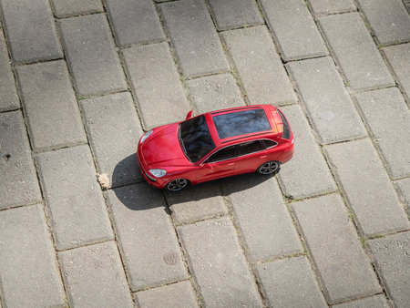 Red model toy cars on stone tiles in the street
