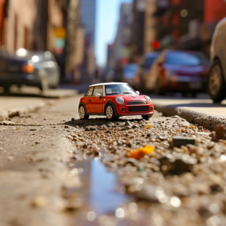 Close-up view of a toy car in a city setting.