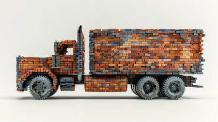 An old truck made of construction debris stands on a white background. 3d illustration.