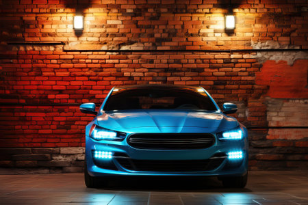 Glowing sports car on brick wall background, car with orange lanterns at night.