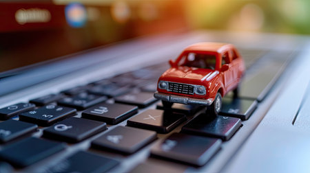 Digital insurance concept: Close-up of a small car on a laptop keyboard