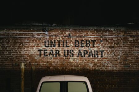 Until Debt Tear Us Apart stencilled in a car park