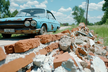 A classic blue car stands idle next to a crumbling brick wall under a bright sky, surrounded by greenery.
