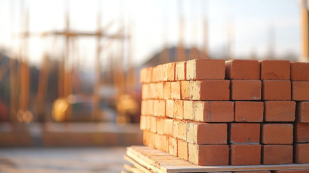 A stack of red bricks neatly arranged on a construction site, with a blurred background of ongoing building work.