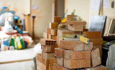 Red ceramic bricks at the construction site. Keramoblock. Hollow brick. Construction of a red brick building. close-up. Material for the construction of walls and partitions