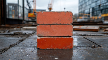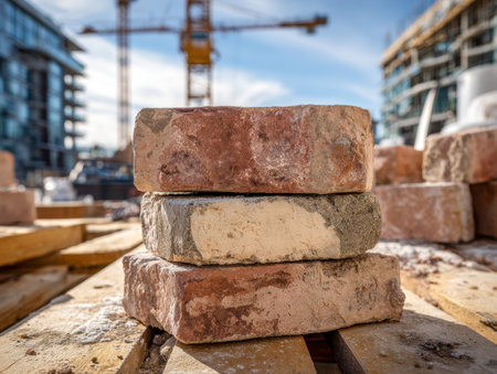 A trio of aged bricks rests unevenly on a wooden pallet, set against a sunlit urban backdrop with cranes and scaffolding softly blurred behind the scene.