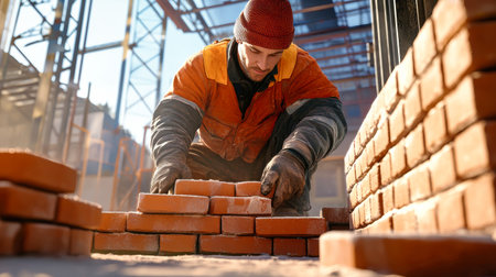 A construction worker carefully places bricks with precision on a building site. The sun shines brightly, illuminating the hard work involved in the masonry.