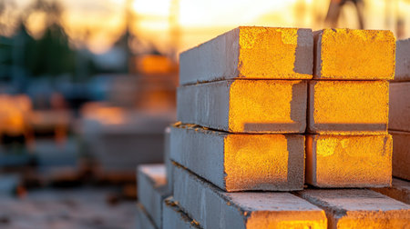 A detailed view of an industrial brick stacking process showcases bricks arranged neatly in a production facility during sunset, highlighting the mood and environment.