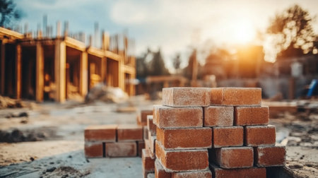 Stacked red bricks are neatly arranged at a construction site. A brick wall is visible in the background, showcasing ongoing building activity under clear blue skies.