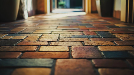 A beautifully laid brick floor in a cozy indoor space, illuminated by soft natural light. The colorful tiles create a warm and inviting atmosphere. Perfect for home design inspiration.