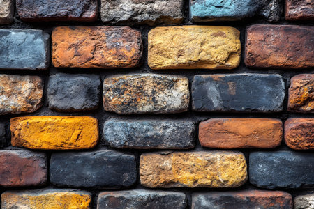 A vivid array of rustic bricks in varying colors and textures, creating a captivating pattern ideal for design projects. the diverse hues of red, yellow, orange, and blue add depth and visual interest. Generative AI
