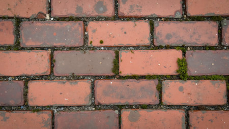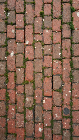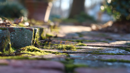 Rustic brick sidewalk with moss patches