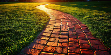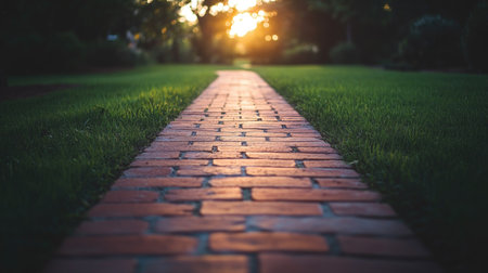 A charming brick pathway illuminated by the warm glow of sunset in a serene garden setting, perfect for evoking tranquility and natural beauty in visual projects.