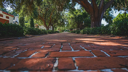 Captivating worm's eye view of a beautifully textured brick pathway, surrounded by lush greenery. A tranquil outdoor scene showcasing vibrant colors and intricate details.