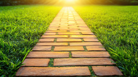 A captivating view of a brick pathway disappearing into the sunlight, surrounded by lush green grass, offering a serene and inviting landscape experience.