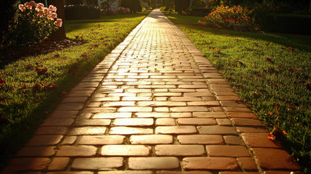 This image showcases a long brick sidewalk, warmly lit by sunlight, creating an inviting atmosphere surrounded by vibrant greenery and flowers, perfect for serene outdoor walks.