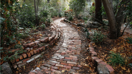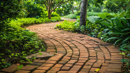A charming garden pathway winds through rich greenery, featuring a textured brick surface and surrounded by vibrant foliage, creating a peaceful outdoor escape.