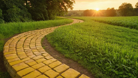 A scenic view of a brick path leading toward a stunning sunset, surrounded by lush grass and greenery, creating a tranquil and picturesque atmosphere.