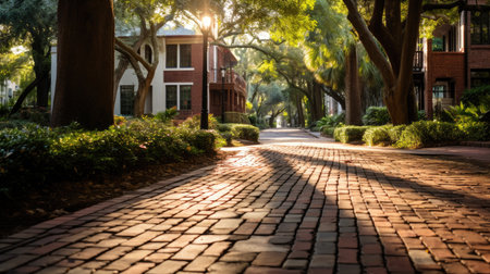 A close up of a brick road with the sun shining on it, AI