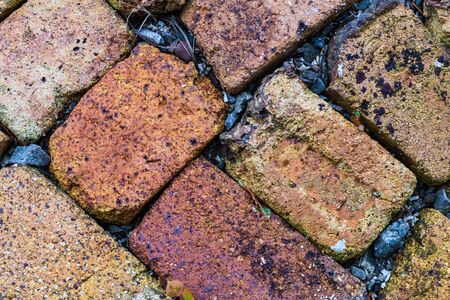 Top view of old beautiful multicolor bricks paving stones footpath pattern on sidewalk outdoors as brickwork weave texture or abstract stone paver background. Pavement Surface. Background and texture.