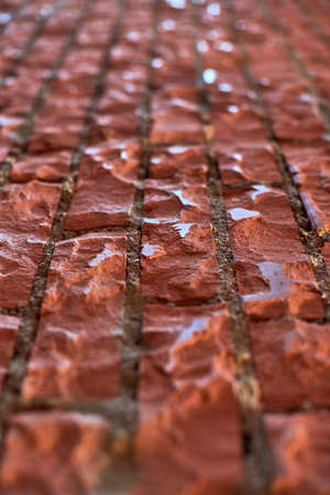 pink paving slab after rain for background. Wet red paving slabs after rain. The texture of the paved tile on the bottom of the street. Cement brick squared stone floor background. Concrete paving