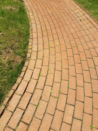 A brick walkway leads to a paved road, with a mix of gray and reddish-brown bricks