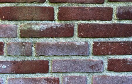 A close-up view of a weathered red brick wall with visible texture, mortar, and patches of moss.