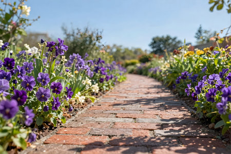 A scenic view of a charming brick sidewalk illuminated by warm sunlight. The path invites visitors into a serene park setting, surrounded by lush greenery and blooming flowers, perfect for leisurely strolls.