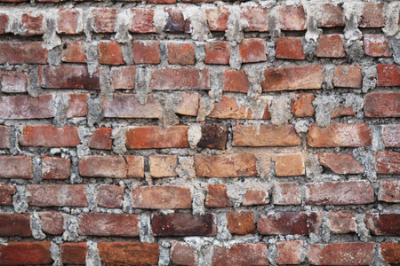 Detailed close-up of a weathered red brick wall with visible mortar, showing rustic textures and urban architectural charm.